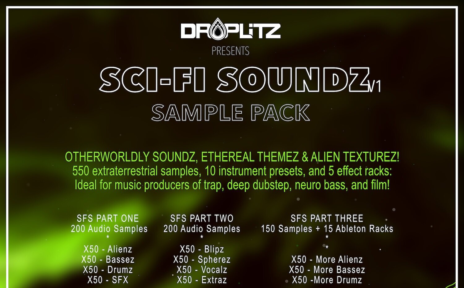 WELCOME TO SCI-FI SOUNDZ PART THREE: in part three of this sample pack you will get 150 individually processed, extraterrestrial samples! This part of the pack focuses on providing more tools and noises for the top of your alien beats! With 15 Ableton presets to get you inspired, you'll be writing beats so alien you might start picking up signals from other planets!